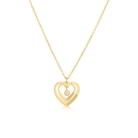 Colar em prata dourada com dois corações e gravação "Adoro-te Madrinha". No centro, pequena zircónia redonda incolor. Fio ajustável.